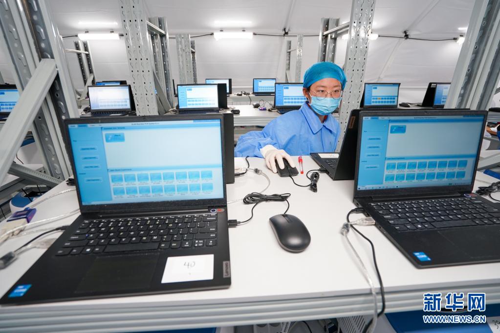 工作人员在“猎鹰号”硬气膜实验室核酸扩增分析区内作业(8月14日摄)。新华社记者 李博 摄