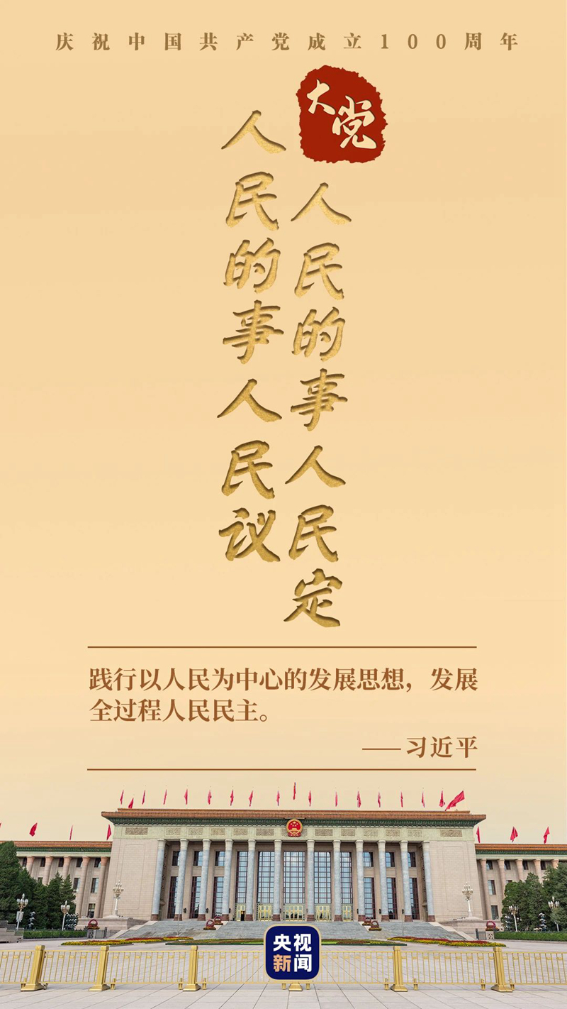 2021年7月1日,习近平总书记在庆祝中国共产党成立100周年大会上发表重要讲话指出,“践行以人民为中心的发展思想,发展全过程人民民主。”