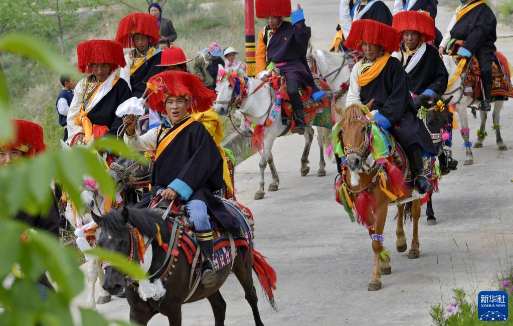 易地扶贫搬迁新村——西藏山南市加查县冷达乡共康村村民们身着盛装欢度“望果节”(7月9日摄)。新华社记者 张汝锋 摄