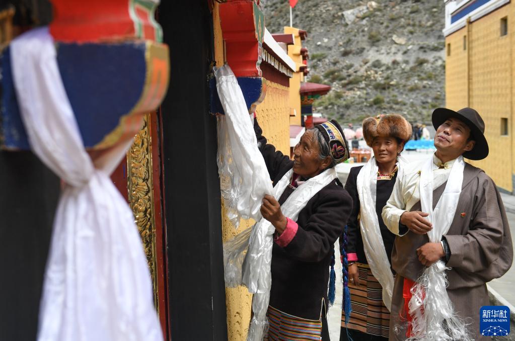 西藏山南市洛扎县洛扎镇居民旦增曲珍(左)给新房献哈达(2019年9月21日摄)。新华社记者 晋美多吉 摄
