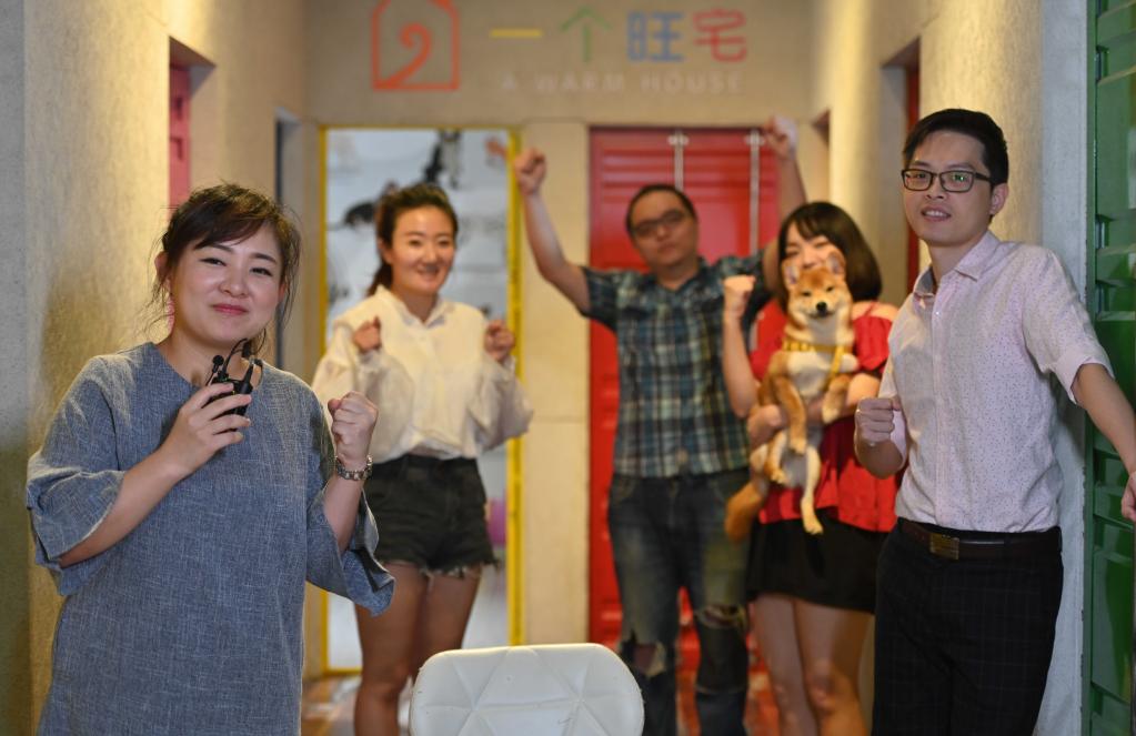 在福建厦门进行网红经济创业的台青(左一),与她的主播们在直播后一起加油鼓劲。新华社记者魏培全摄