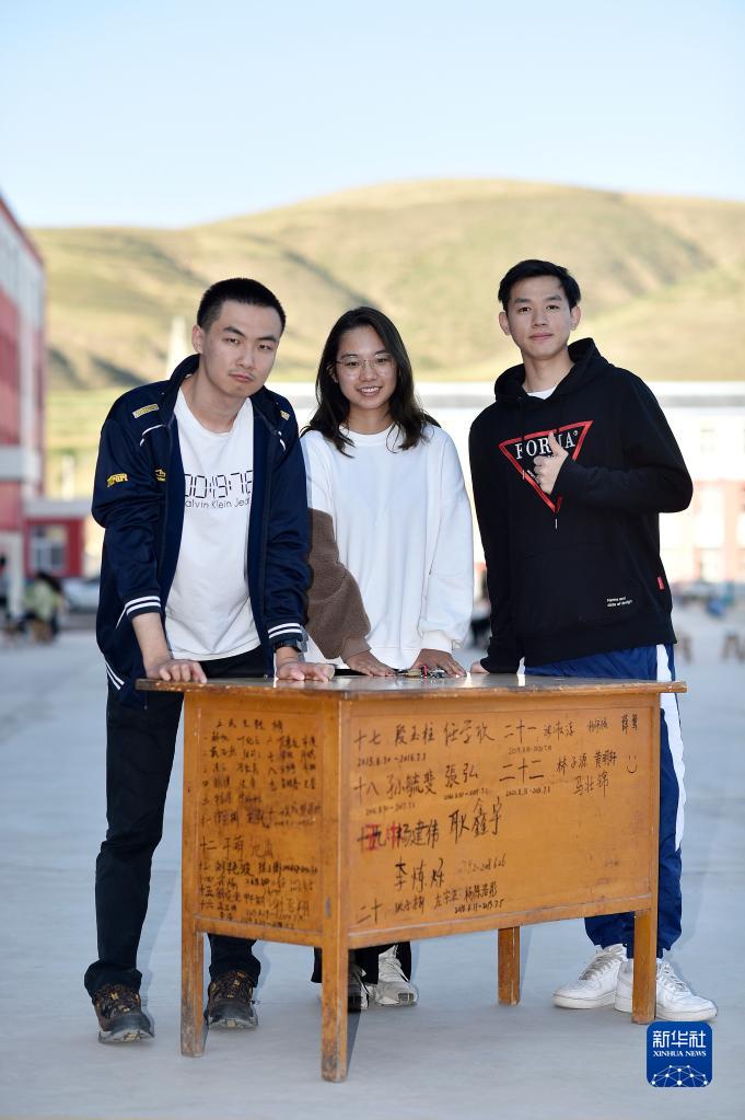 复旦大学第23届研究生支教团支教老师史欣安(左)、林伯韬(右)、徐菁在王民中学写满历届支教老师名字的旧课桌前合影(9月1日摄)。新华社记者 王鹏 摄