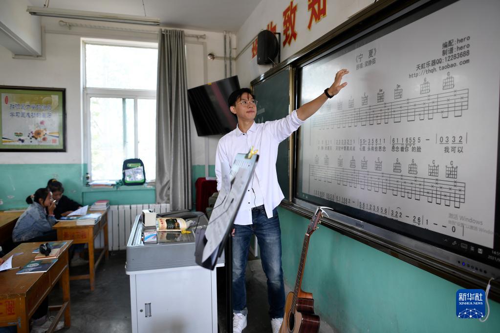 复旦大学第23届研究生支教团支教老师林伯韬在为学生上音乐课(9月2日摄)。新华社记者 王鹏 摄