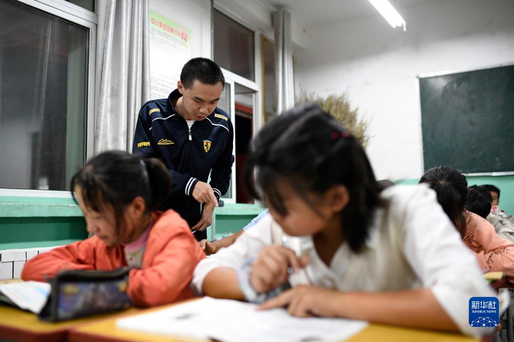 复旦大学第23届研究生支教团支教老师史欣安在晚自习上为学生解答问题(9月1日摄)。新华社记者 王鹏 摄