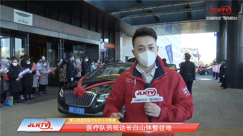 吉林广播电视台记者姚勃在长白山直播报道吉林省支援湖北医疗队凯旋