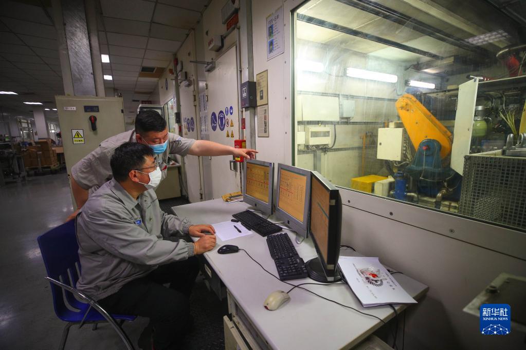 一汽解放大连柴油机有限公司的高级技师鹿新弟(前)在车间检查柴油机的运行状况(2020年5月7日摄)。新华社记者 龙雷 摄