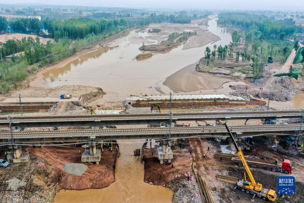 这是10月13日拍摄的南同蒲铁路昌源河大桥抢险现场(无人机照片)。新华社记者 曹阳 摄