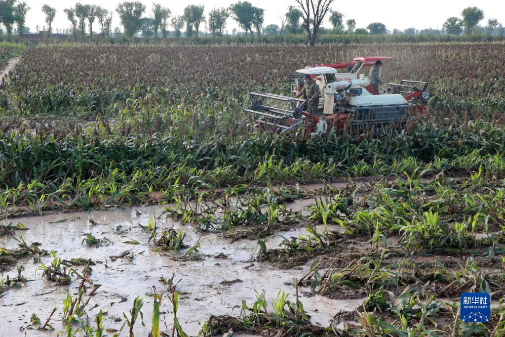 10月11日,山西省平遥县东游驾村的村民在抢收受灾的高粱。新华社记者 曹阳 摄