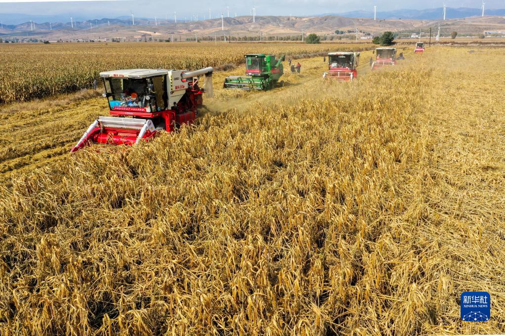 10月13日,收割机在山西省繁峙县郝家湾村抢收受灾倒伏的谷子(无人机照片)。新华社记者 曹阳 摄