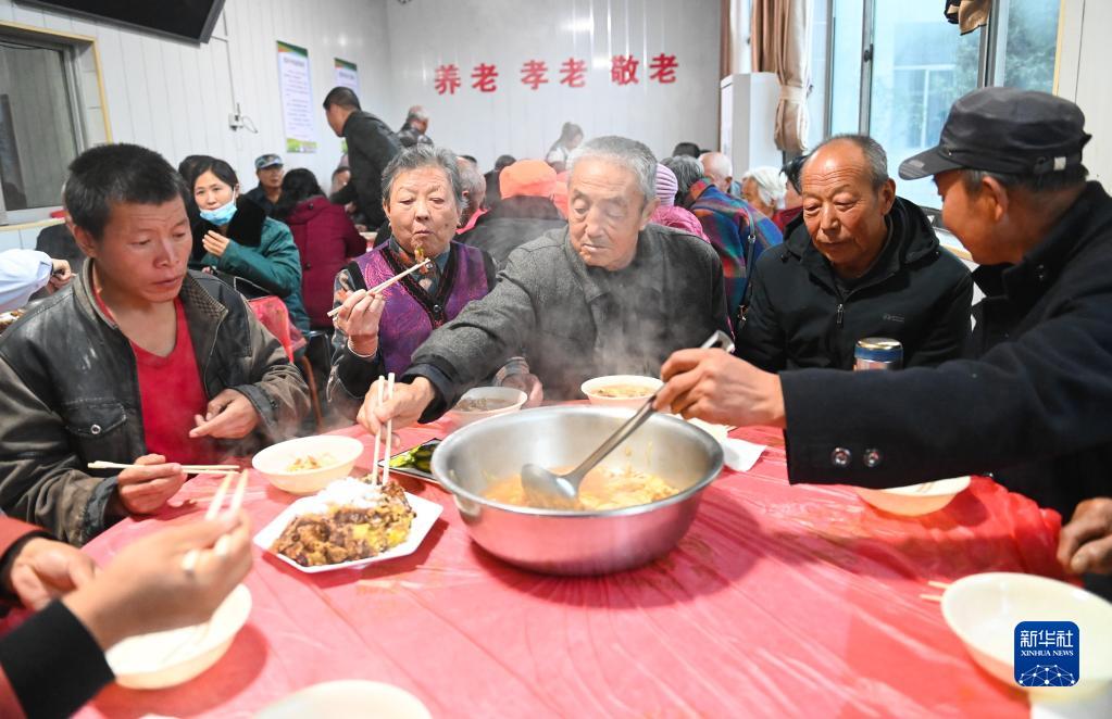 10月10日,在山西省汾西县永安镇后加楼村的安置点,受灾群众在吃饭。新华社记者 柴婷 摄
