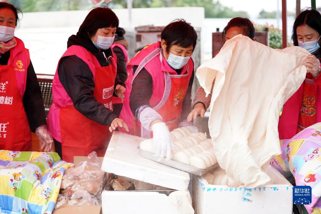 在山西省稷山县滨河广场,“阿姨团”成员将蒸好的馒头放到箱子里保温(10月12日摄)。在稷山县滨河广场搭起的几座简易棚里,有一支特别的抗洪队伍——由200多位妇女组成的“阿姨团”。洪水来临时,她们主动来到抗洪前线当志愿者。发现抢险人员经常吃不上热饭,她们决定搭棚支锅,供应热饭热菜。新华社记者 詹彦 摄