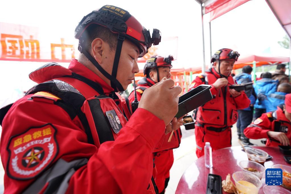 在山西省稷山县滨河广场,抢险人员在吃“阿姨团”为他们准备的饭菜(10月12日摄)。在稷山县滨河广场搭起的几座简易棚里,有一支特别的抗洪队伍——由200多位妇女组成的“阿姨团”。洪水来临时,她们主动来到抗洪前线当志愿者。发现抢险人员经常吃不上热饭,她们决定搭棚支锅,供应热饭热菜。新华社记者 詹彦 摄