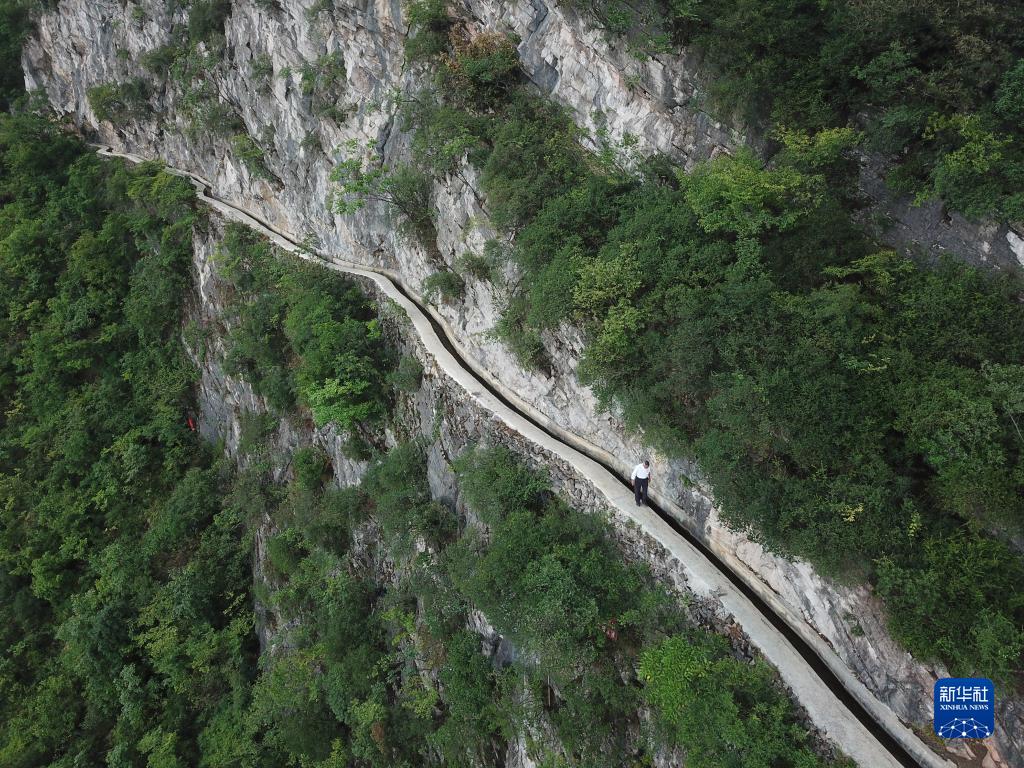 黄大发沿着修建在绝壁上的“大发渠”巡查(2018年8月11日摄,无人机照片)。新华社记者 刘续 摄