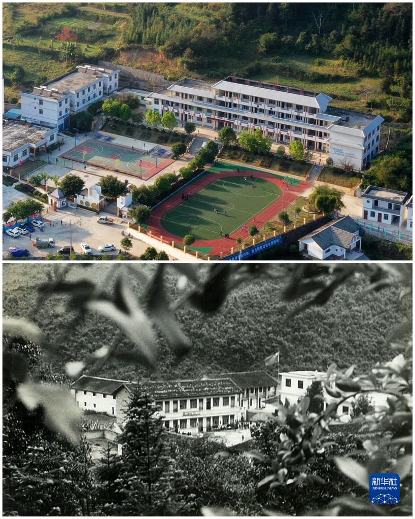 拼版照片:上图为2019年11月5日拍摄的贵州省荔波县瑶山民族小学新貌(无人机照片,新华社记者杨文斌摄);下图为荔波县瑶山民族小学旧貌(资料照片)。新华社发