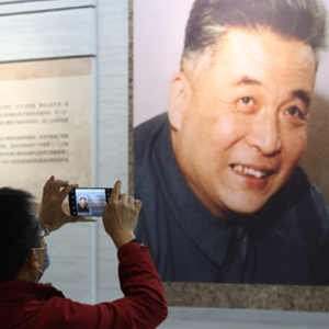 一位参观者在拍摄邓稼先的照片和生平事迹介绍。