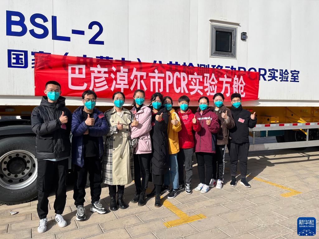 巴彦淖尔市援助额济纳旗医疗队队员、巴彦淖尔市医院检验科副主任李婷(左三)和来自巴彦淖尔市的其他9名核酸检测人员合影(11月1日摄)。新华社发(张琪 摄)