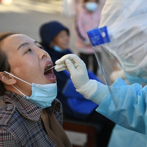 在因疫情封控的阿拉善盟额济纳旗达来呼布镇天赋佳苑小区内,医务人员为居民进行核酸采样(10月20日摄)。新华社记者 贝赫 摄