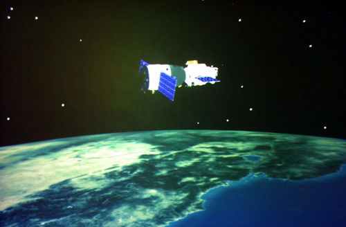2002年3月27日,记者从北京航天飞行控制中心了解到,神舟三号无人飞船按预定轨道飞行正常,已环绕地球飞行30圈,空间科学实验进展顺利。这是飞船飞行实况模拟图像。 新华社记者李刚摄