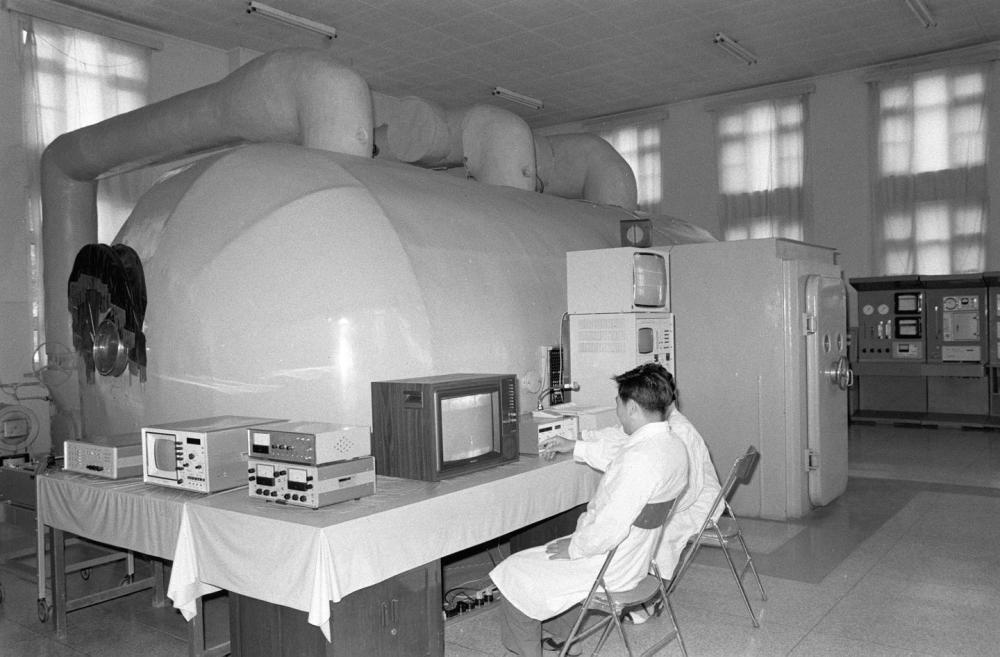 中国航天医学工程研究所用于载人航天医学工程研究的地面模拟设备——我国自行研制的宇宙飞船环境模拟舱。它用于宇航员的选拔、训练和科学实验。新华社记者吴森辉摄(1988年4月17日发)