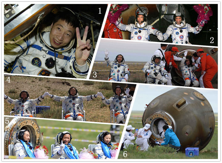 图1为神五返回舱成功着陆,航天员杨利伟自主出舱。(王建民摄影)图2为神六返回舱成功着陆,航天员费俊龙、聂海胜向人们致意。(王建民摄影)图3为神七航天员翟志刚、刘伯明、景海鹏出舱。(王建民摄影)图4为神九航天员景海鹏、刘旺、刘洋出舱后致意。(王建民摄影)图5为2013年6月26日,圆满完成神舟十号任务的三位航天员张晓光、聂海胜、王亚平。(张领摄影)图6为2013年6月26日,工作人员在进行开舱处置。(张领摄影)