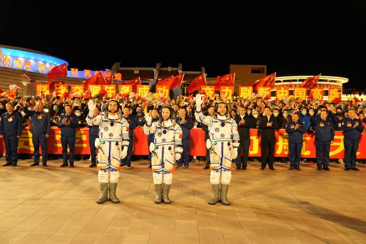 10月15日晚,神舟十三号载人飞行任务航天员乘组出征仪式在酒泉卫星发射中心问天阁广场举行。翟志刚(右)、王亚平(中)和叶光富即将开启为期6个月的飞行任务。新华社记者 李刚 摄