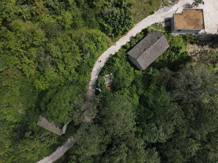 杜海英和爷爷最初居住的老房子(左)和四位交警“爸爸”凑钱给她家修建的房屋(右二)。(无人机照片)(9月2日摄)