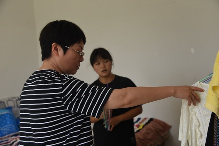 董君(前)在给杜海英收拾行李。(9月2日摄)