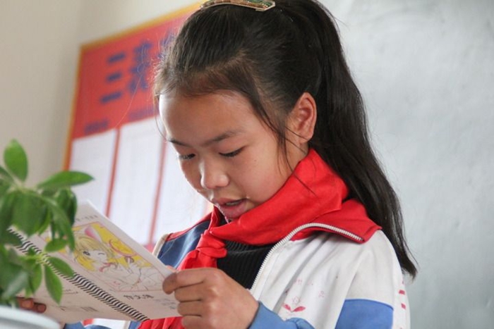 课堂上,梁小丽在朗读她写的作文《刘叔叔、董阿姨,我想对您说》。(长顺县公安局交警大队供图)