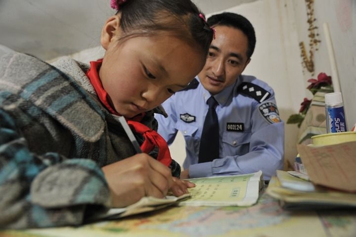 2012年5月15日,田维春辅导杜海英做作业。(长顺县公安局交警大队供图)