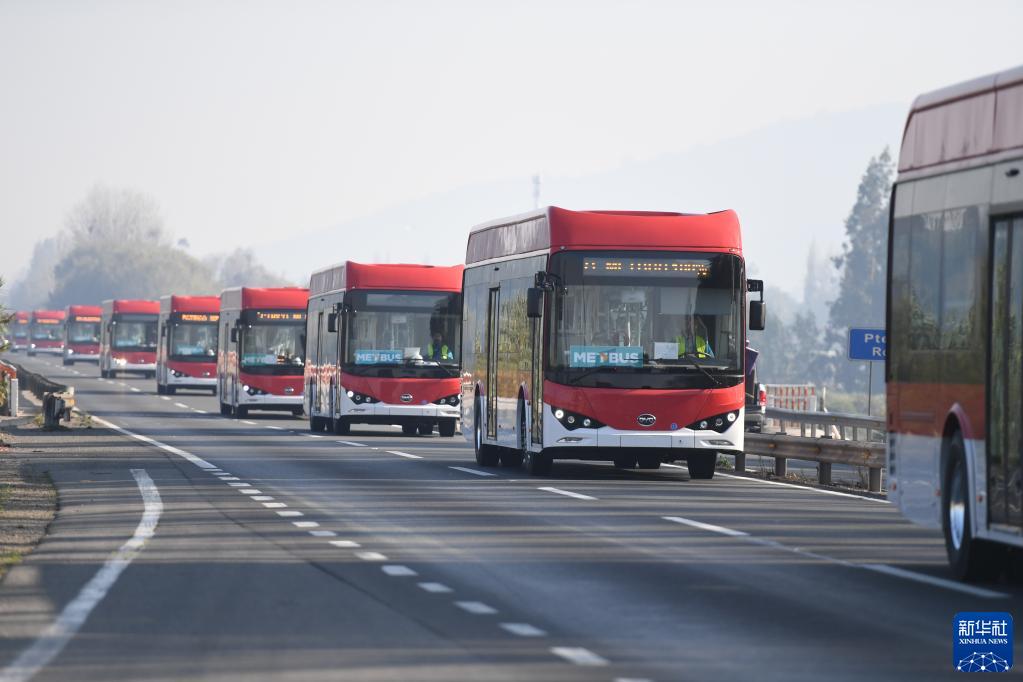 2020年6月6日,一批比亚迪纯电动大巴从智利圣安东尼奥港驶往首都圣地亚哥。新华社发(Enel公司供图)