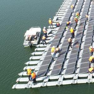 2021年1月23日,施工人员检查泰国乌汶府诗琳通大坝综合浮体光伏项目的太阳能板安装情况。新华社发(泰国国家电力局项目组供图)