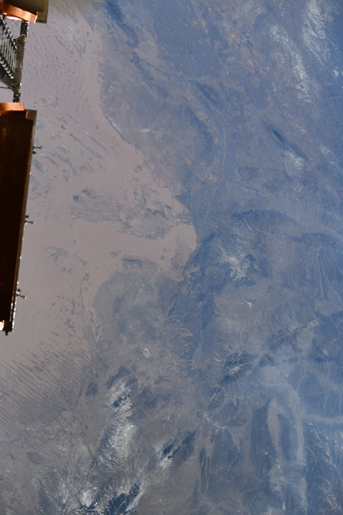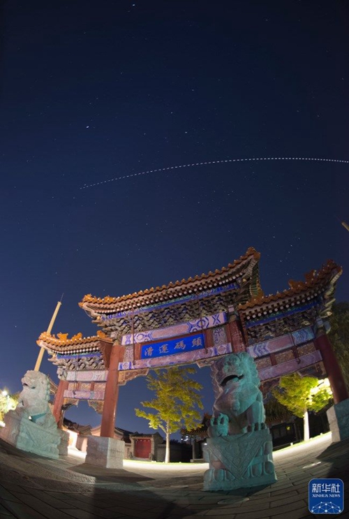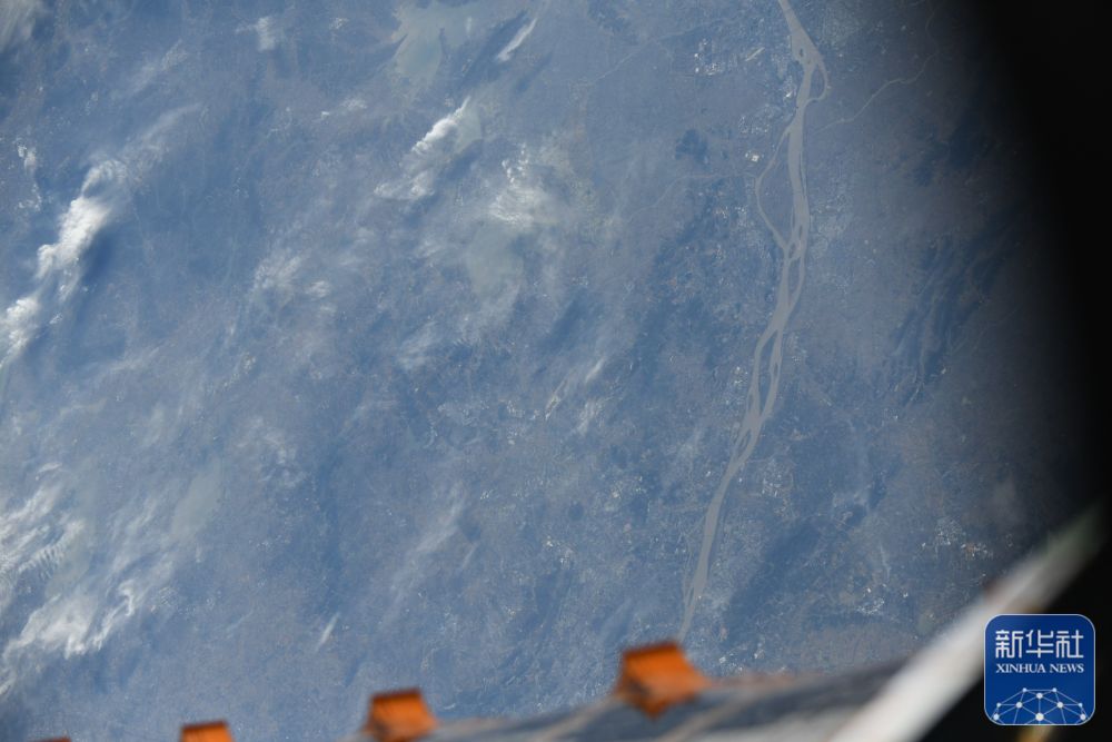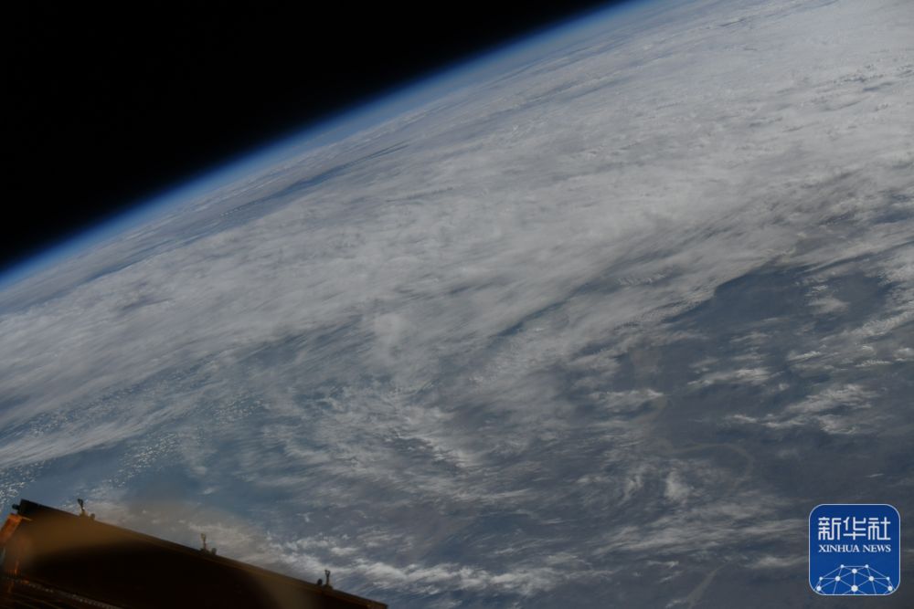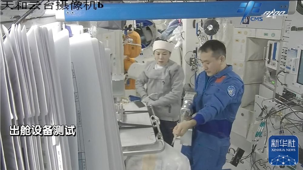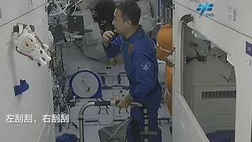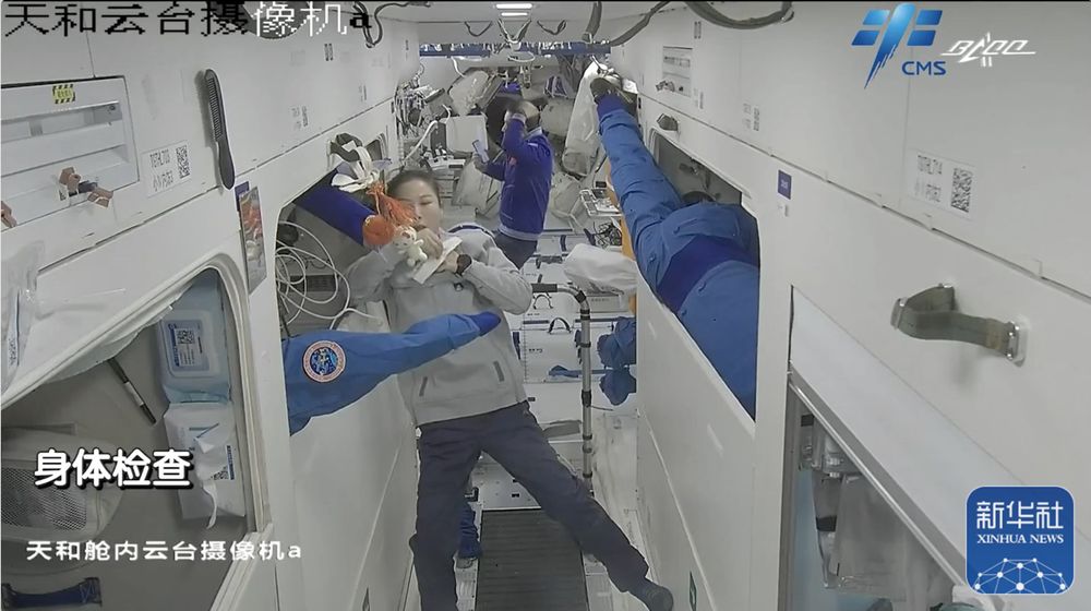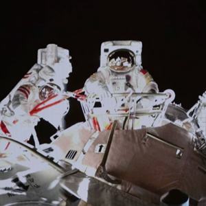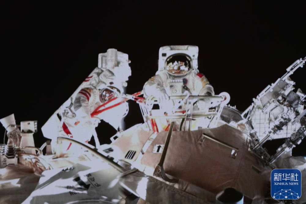 航天员王亚平(右)结束出舱任务的画面。郭中正 摄