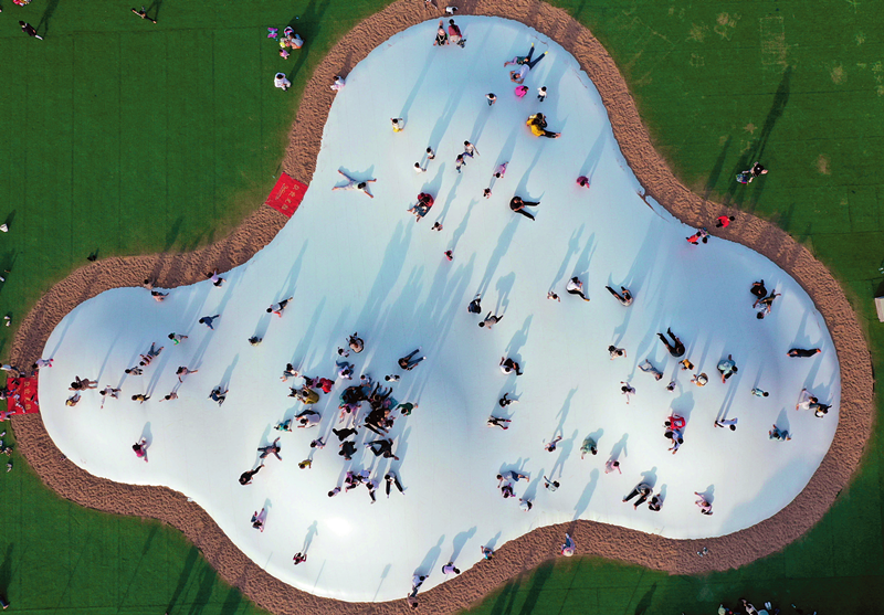 2020年11月15日,江西省赣州市章贡区沙河镇的罗坑体育特色小镇,游客在体验户外蹦床项目 彭昭之摄/本刊