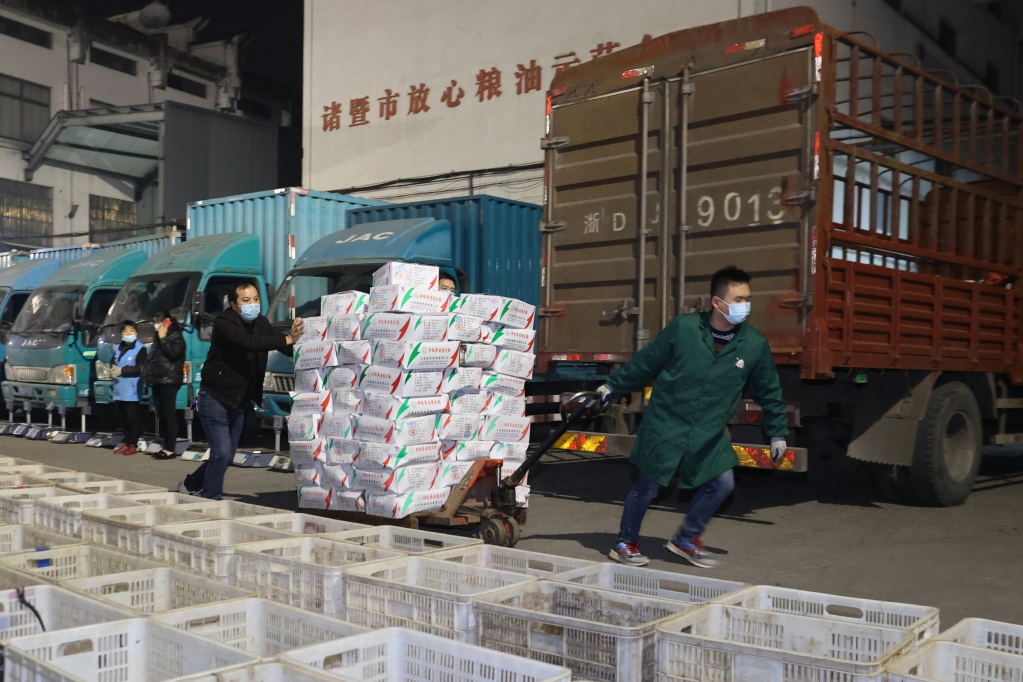 12月11日夜,诸暨市一百集团仓库连夜准备支援物资。(诸暨市委宣传部供图)