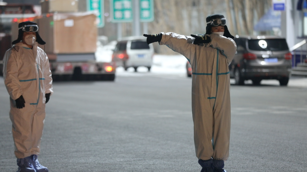 疫情期间,民警在哈尔滨一卡点执勤。(新华社记者王鹤 摄)