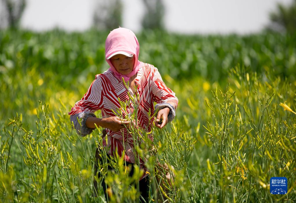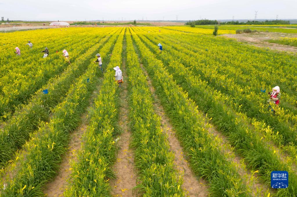 在宁夏吴忠市红寺堡区柳泉乡柳泉村,村民在采摘黄花菜(2020年7月7日摄)。新华社记者 杨植森 摄
