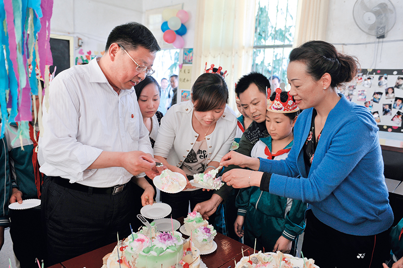 2013年5月,蒙汉(左)在乡镇走访调研时为留守儿童过生日 摄影/本刊
