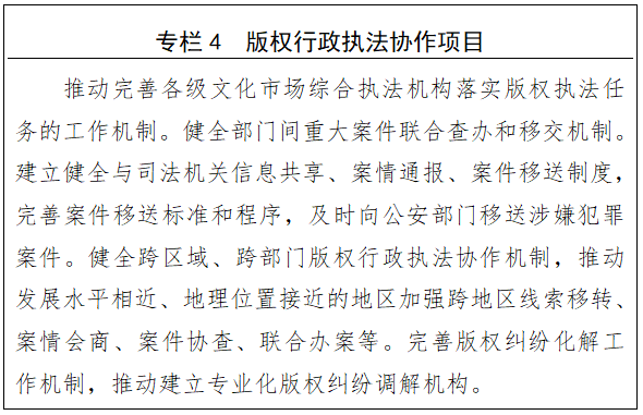 3. 加强版权执法协作。进一步加强对文化市场综合执法机构的指导,有效发挥文化市场综合执法机构的版权执法职能。加强与工信、公安、海关、市场监管、网信等部门的执法协作。巩固加强两法衔接机制,进一步推动版权行政执法与刑事司法的有效衔接。在案件多发地区探索建立仲裁、调解优先推荐机制。建立健全版权案件分流制度,推进案件繁简分流机制改革。充分发挥全国打击侵权假冒领域行政执法与刑事司法衔接工作信息共享平台和国家版权监管平台的作用,加强数据管理和有效应用,提高衔接工作效率和规范化水平。