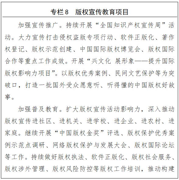 各级版权主管部门加大版权工作力度。国家版权局推动完成与著作权法配套的行政法规、部门规章及规范性文件的制定和修订工作;每年组织开展2次全国性版权执法专项行动;每年组织开展1次软件使用情况年度核查;每年授予2至3个全国版权示范城市、5至10家全国版权示范园区(基地)、20至30家全国版权示范单位。著作权登记制度更加完善,登记质量显著提升,登记数量不断增长,作品登记数量年均增长10%以上,2025年全国作品登记数量超过500万件;计算机软件著作权登记数量年均增长12%以上,2025年全国计算机软件著作权登记数量超过300万件。到2025年,版权产业增加值占国内生产总值的比重提高到7.5%左右,核心版权产业增加值占国内生产总值的比重提高到4.75%左右。