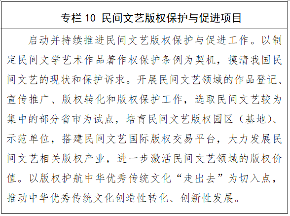 3. 推动民间文艺版权保护国内立法实践和国际推广联动。坚持文化自信,依托国内丰富的多民族和民间文艺资源,坚持交流互鉴、开放包容、以我为主、为我所用的原则,推动完善民间文艺版权保护国内立法,着力解决我国在传统文化表现形式的传承、利用、保护和弘扬等方面存在的版权问题,大力发展民间文艺相关版权产业。积极推动国际民间文艺版权对话交流,以国内立法和实践经验为基础,深度参与相关国际规则制定,贡献中国经验和中国智慧。