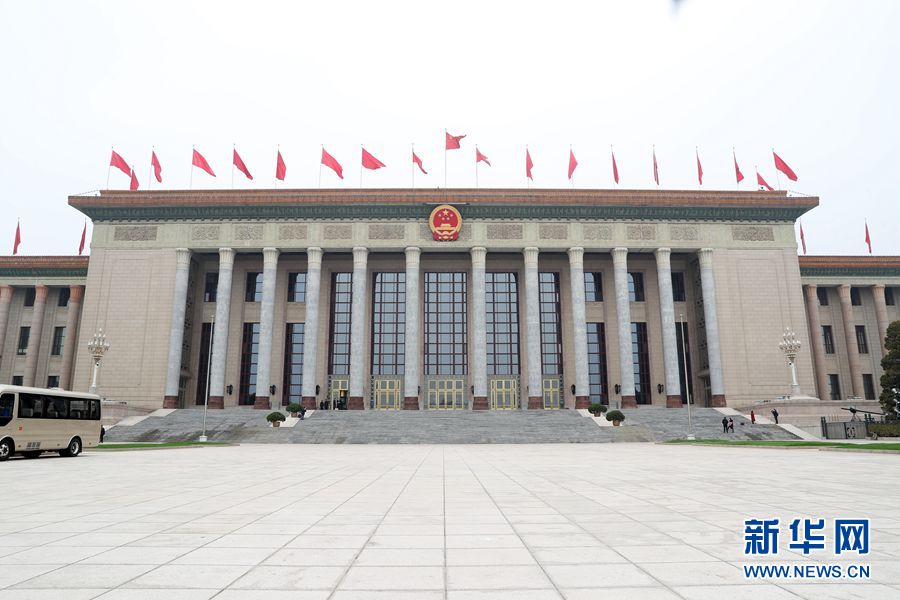 3月3日,全国政协十三届四次会议召开新闻发布会。大会新闻发言人郭卫民向中外媒体介绍本次大会有关情况并回答记者提问。图为人民大会堂外景。新华网 翟子赫 摄