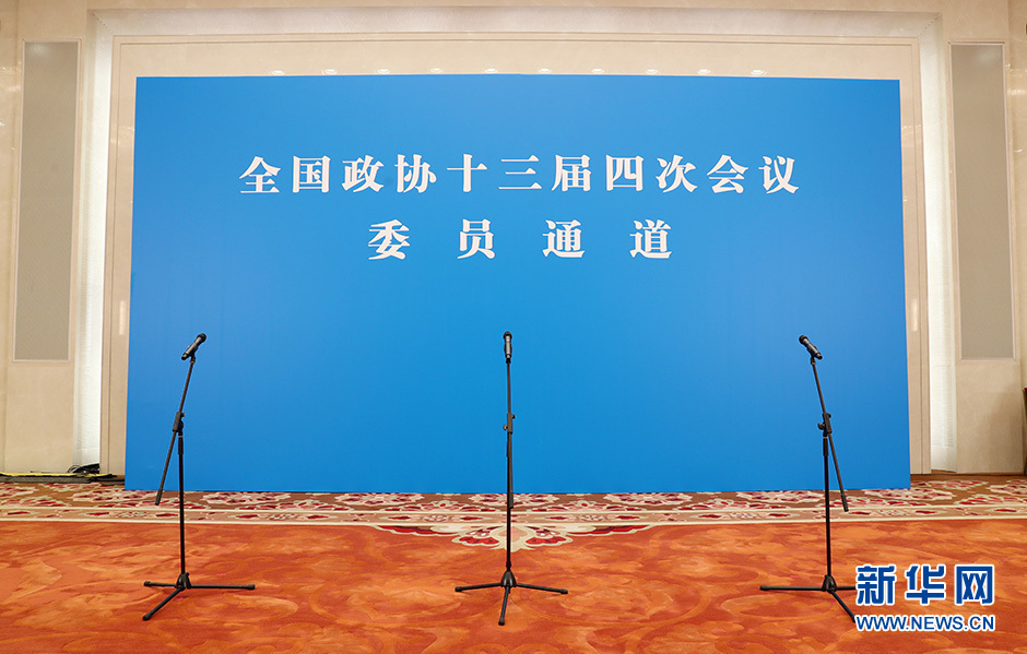 全国政协十三届四次会议首场“委员通道”采访活动于3月4日在人民大会堂新闻发布厅举行,邀请部分全国政协委员通过网络视频方式接受媒体采访。图为“委员通道”现场。新华网 王翰林 摄