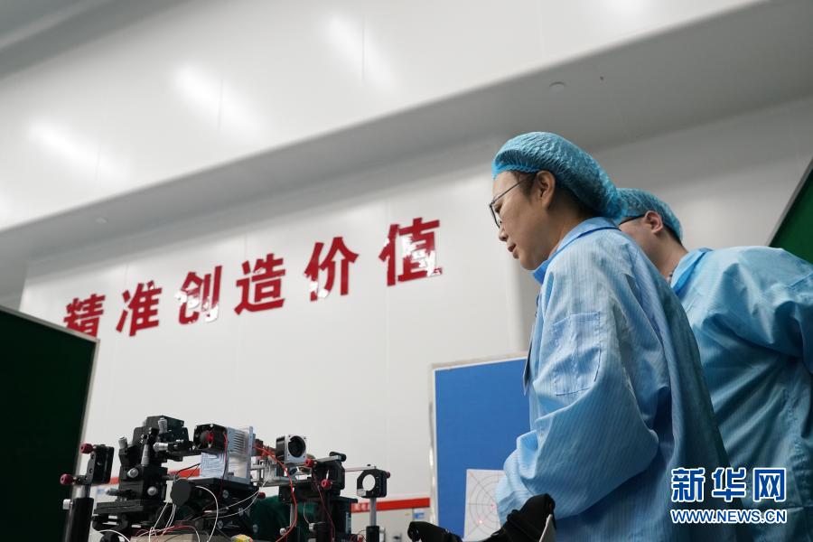 在中国航空工业集团公司洛阳电光设备研究所,羊毅与团队成员在实验中讨论技术问题(2月25日摄)。