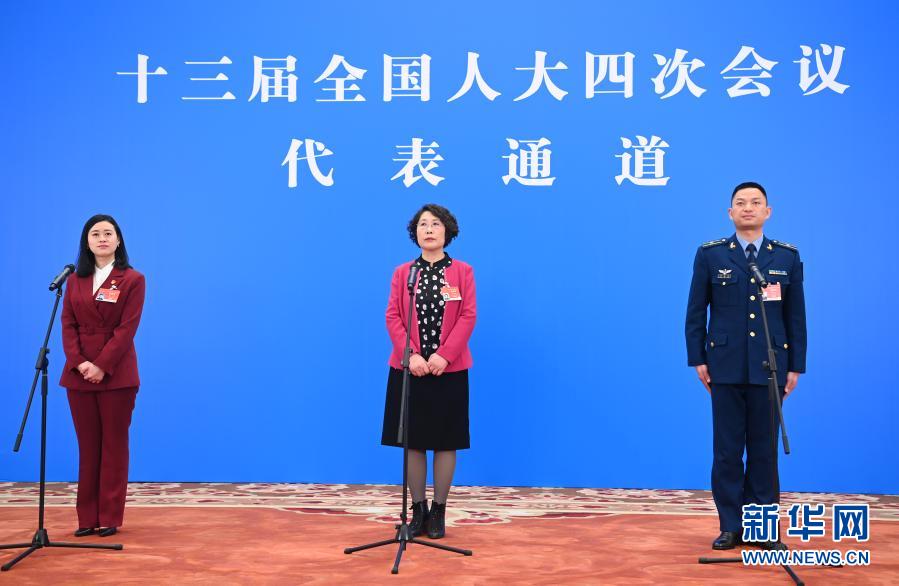 3月5日,第十三届全国人民代表大会第四次会议举行首场“代表通道”采访活动。这是全国人大代表袁晶、郭艳玲、余海龙(从左至右)通过网络视频方式接受采访。新华社记者 金良快 摄