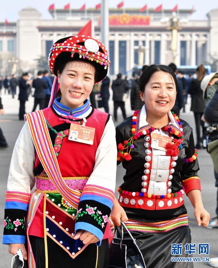 3月8日,十三届全国人大四次会议在北京人民大会堂举行第二次全体会议。这是两位女代表走向会场。