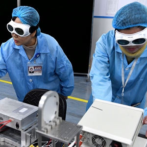 2月25日,在中国航空工业集团公司洛阳电光设备研究所,航空工业集团光电专业特级技术专家羊毅(左)与团队成员在实验室做实验。新华社记者 李安 摄