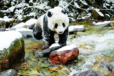 正在过河的野生大熊猫 胡万新摄/光明图片