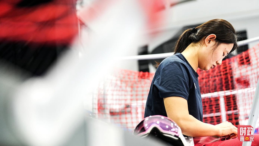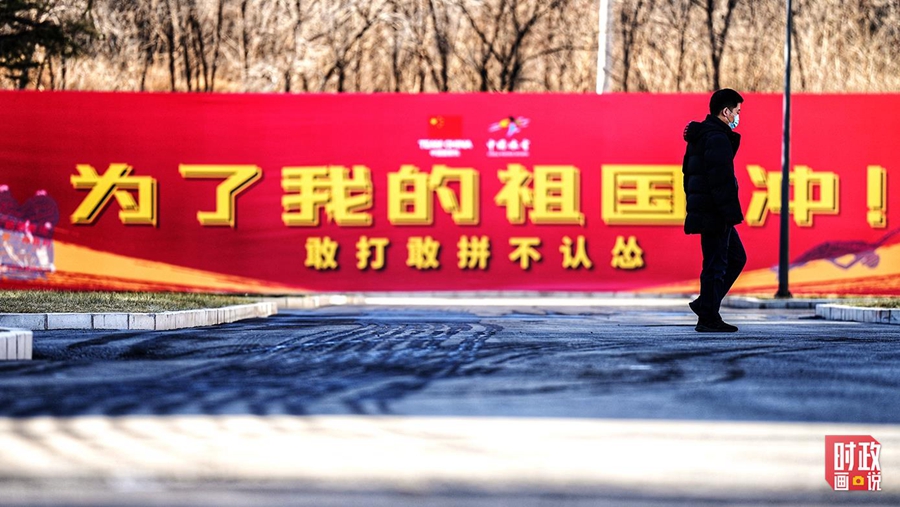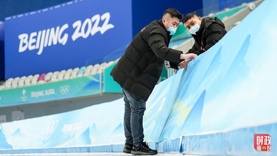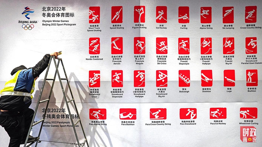 工作人员在张贴北京2022年冬奥会体育图标。“备赛”是习近平总书记本次冬奥考察关键词之一。目前,中国已实现北京冬奥会109个小项全项目开展、全项目建队,并有望在多个项目上实现历史突破。