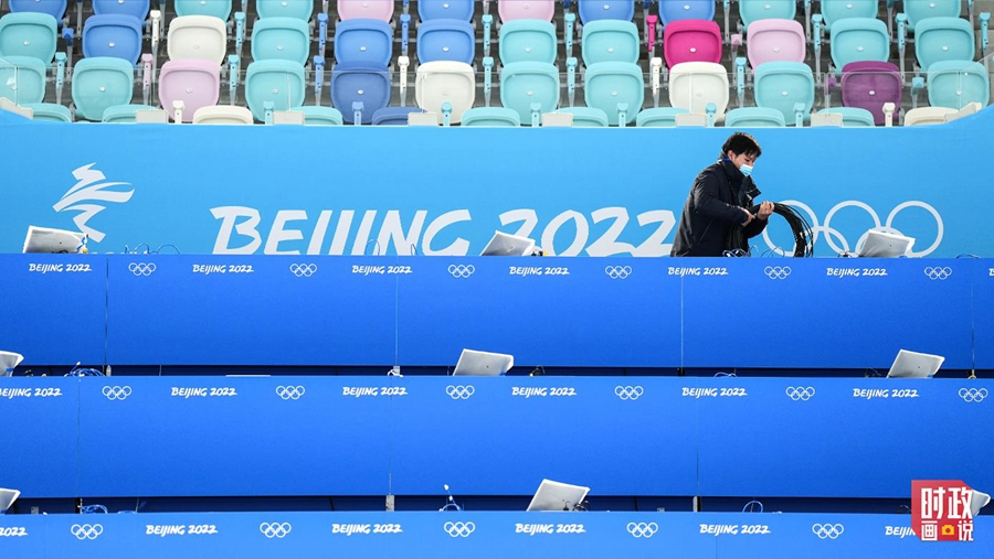 工作人员在场馆媒体评论席布线调试。赛时,国家速滑馆将成为冬奥金牌“大户”,将产生14块速度滑冰项目金牌。