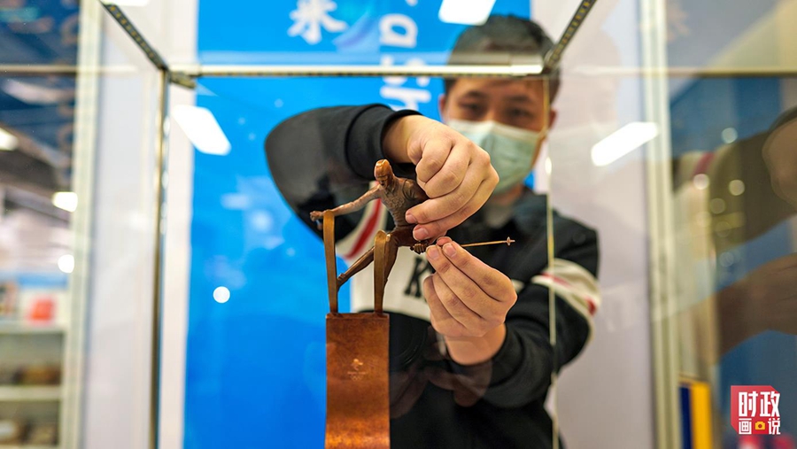 北京冬奥村奥运特许商品专卖店内,工作人员将自由式滑雪运动员铜雕摆放上架。赛时,冬奥村将为各国运动员和随队官员提供3000多个床位及商业服务。